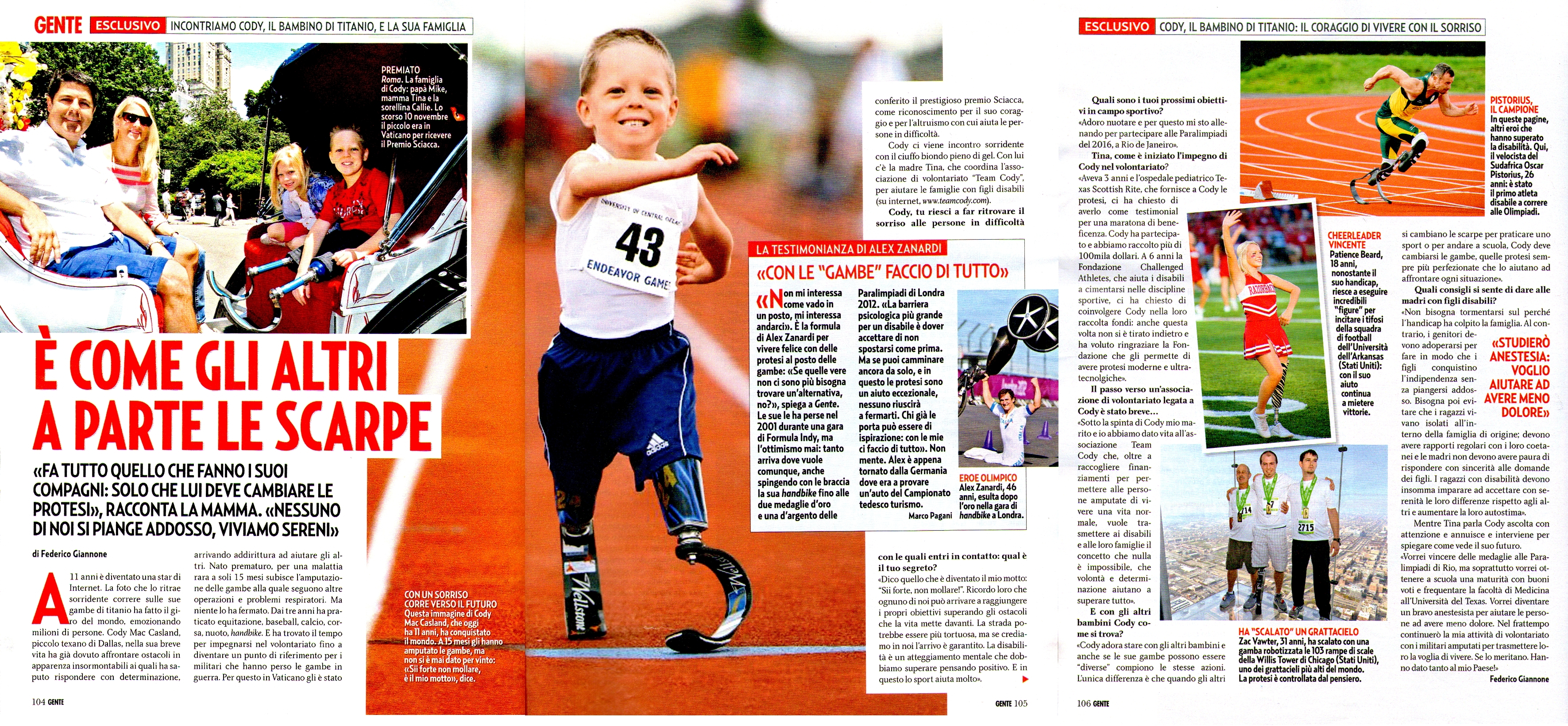Il settimanale Gente questa settimana dedica uno speciale alla storia di Cody McCasland, il bambino di 11 anni che gareggia con gambe artificiali, Vincitore Assoluto del Premio Internazionale “Giuseppe Sciacca” 2012.
