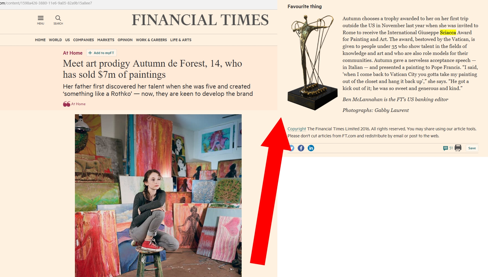 In particolare, ci piace sottolineare in questa sede il risalto che ha avuto sui mass media di tutto il mondo la giovanissima pittrice Autumn De Forest, recentemente intervistata dal prestigioso Financial Times, cui ha confidato che il suo oggetto preferito è proprio la scultura ricevuta a Roma lo scorso novembre, come premio nella sezione “Arte”, nel corso del Premio Sciacca 2015.